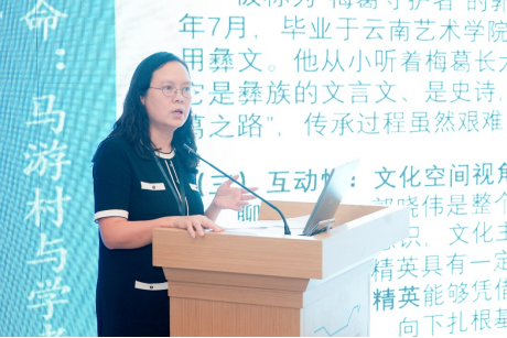 迟燕琼教授的发言主题为《彝族<梅葛>的典籍化传承》,整个报告以“一个村”“一个人”为线索,即以马游村为研究场域,以“梅葛守护者”郭晓炜为研究主体对彝族《梅葛》的传承展开讨论。迟老师首先从文化空间视角下村落与民俗精英的互动性探讨了马游村与传承人郭晓炜之间“家园与使命”的《梅葛》传承之路;随后从“梅葛”分类及其艺术表现两个层面阐述了口头叙事和民间信仰中的《梅葛》,从学者的文化主体性、非遗传承的双创探索、正面评价激励作用三个方面研究了以彝族史诗《梅葛》为中心的少数民族艺术典籍化传承的实践路径;最后从精英传承、族系传承、地域文化认同、共有精神家园等方面指出彝族《梅葛》的典籍化传承为中华传统文化的伟大复兴、为铸牢中华民族共同体意识起到了重要作用。
