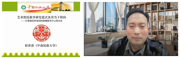 讲座伊始,柏贵喜教授从艺术的民族学研究范式及其当下转向引入,从艺术民族学、民族艺术学、艺术人类学以及艺术文化人类学进行学科概念分析,认为艺术的民族学研究范式有艺术历史、艺术事实、艺术意义与艺术文化批评四类并进行了深度解析。在对艺术民族学研究范式探析的基础上从学科交叉、范式统合的综合性、人文主义与科学主义(技术主义)结合的创新性以及由强调变异(差异)、特色、个案转向强调关系、共享(共同)、区域(流域、圈层、文化廊带)的几个方面进一步阐释了艺术民族学的研究范式趋势。