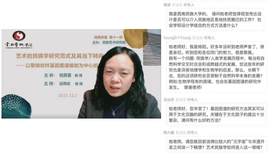 精彩的讲座之后,在线老师与同学们争先提问,柏贵喜教授耐心解答,学术氛围浓郁。迟燕琼教授在讲座总结中认为:从生物发生学的角度,借助社会发生学的研究引入艺术学研究和民族艺术研究,围绕艺术历史,艺术事实,艺术意义、艺术批评四个方面清晰讲解了艺术学民族研究的范式及其转化。进而论证了学科交叉以及范式的综合使用趋势,体现了艺术学民族研究从人文主义向科学主义的范式转化并强调了关系性、共享性和区域性的研究趋势。以黎锦纹样基因图谱编制与理论为例阐述了中华各民族文化基因交流交融的时空关系和中华文化基因符号的共享规律,进而展现了中华民族共同体意识和中华民族文化共同体意识的形成过程。
