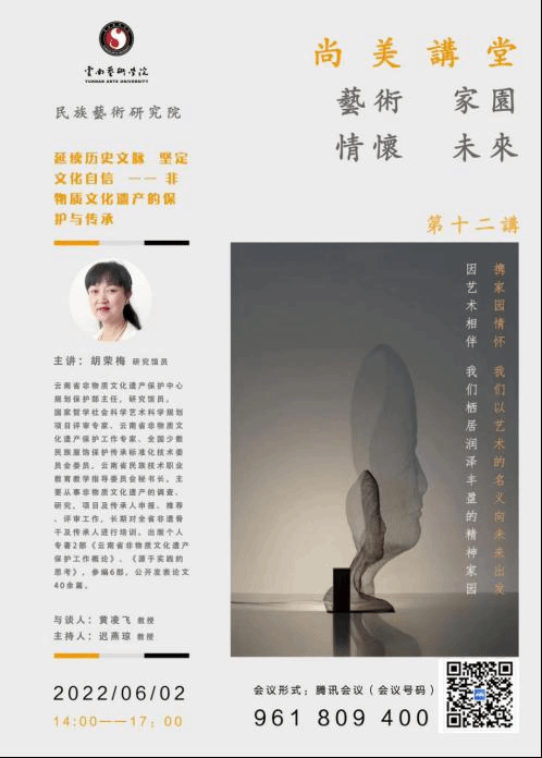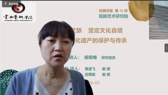 2022年6月2日下午14点,vwin德赢ac米兰官网“尚美讲堂”系列讲座第十二讲在腾讯会议举行。此次讲座我院邀请到云南省非物质文化遗产保护中心规划保护部主任,研究馆员胡荣梅讲授。胡老师受聘于国家哲学社会科学艺术科学规划项目评审专家、云南省非物质文化遗产保护工作专家、全国少数民族服饰保护传承标准化技术委员会委员,云南省民族技术职业教育教学指导委员会秘书长。此次讲座题目为《延续历史文脉 坚定文化自信 —— 非物质文化遗产的保护与传承》。讲座由vwin德赢ac米兰官网党总支书记迟燕琼教授主持,特邀黄凌飞教授作为与谈人。