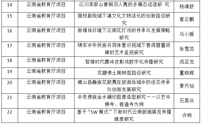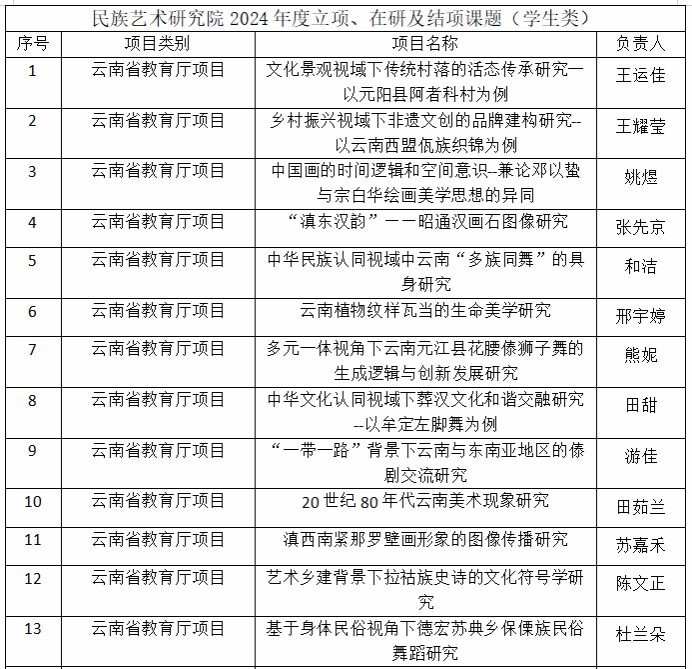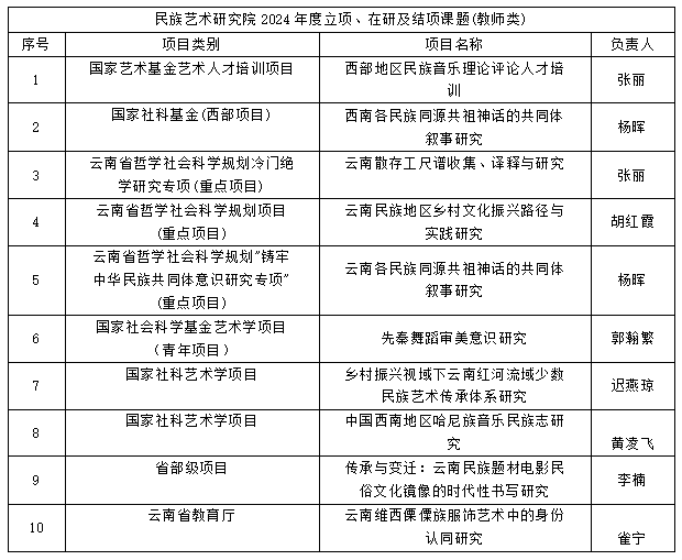 岁聿云暮、日月逾迈,2024年vwin德赢ac米兰官网以深化科研、提升科研成果产出为中心,纵深推进学科建设和人才培养,科研成果丰硕,成效显著。vwin德赢ac米兰官网本年度成功立项国家社科基金(西部项目)1项,国家艺术基金艺术人才培训项目1项,云南省哲社重点项目3项,省级规划项目1项。本年度云南省教育厅研究生项目共申报29项,其中20项获得立项,跟进在研项目16项,研究生项目结项5项。国家社科基金艺术学项目2项顺利结题,科研项目验收合格率达到100%。vwin德赢ac米兰官网正式在编9人,博士后2人,在研项目10项,项目立项和在研占比达91%;研究生总人数94人,在研及立项项目36项,占比达38%。