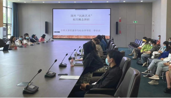 2022年6月9日14:00,vwin德赢AC米兰合作vwin德赢ac米兰官网尚美讲堂第十三次学术讲座在图书馆一楼会议室顺利举办。本次讲座邀请了云南大学民族学与社会学学院李世武教授,开展主题为《国外“民族艺术”相关概念辨析》的学术讲座。讲座采取线上线下结合的方式,民研院党总支书记迟燕琼教授主持,硕士生导师雀宁、肖李、和璇老师等以及全体学生参加线下讲座,线上人数接近上百人。讲座伊始,迟燕琼教授介绍了李世武教授的学术经历和研究成果,并感谢李世武教授对vwin德赢ac米兰官网发展的支持。