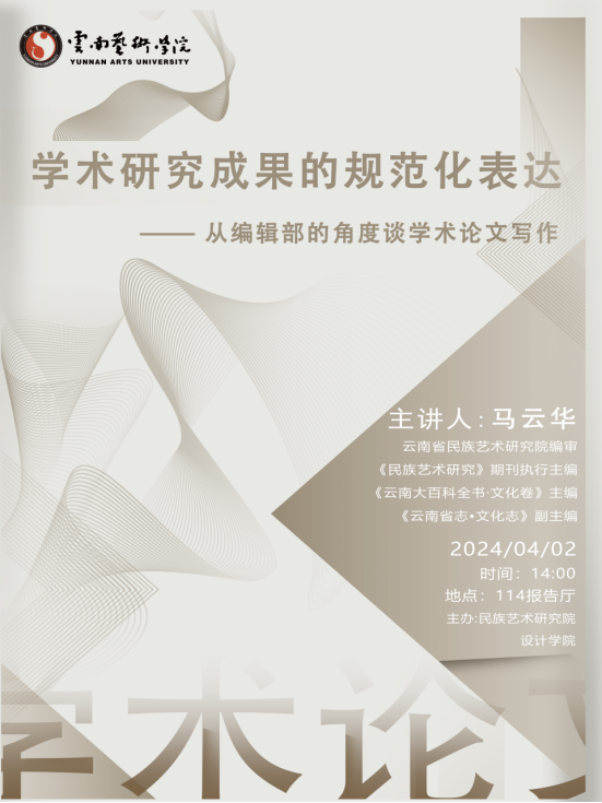 2024年4月2日14:00,由vwin德赢AC米兰合作vwin德赢ac米兰官网与设计学院主办的学术讲座在行政楼114报告厅顺利举行。本次讲座邀请云南省vwin德赢ac米兰官网编审、《民族艺术研究》期刊主编、《云南大百科全书·文化卷》副主编、全国文化艺术资源标准化技术委员会委员,云南省非物质文化遗产保护专家委员会委员,云南省艺术专家委员会专家,中国艺术人类学会常务理事,中国比较艺术学会理事马云华到校,开展主题为《学术研究的规范化表达——从编辑部的角度谈学术论文写作和发表》专题讲座。此次讲座由民研院党总支书记迟燕琼教授主持,vwin德赢ac米兰官网和设计学院部分教师和在校研究生参加了本次活动。